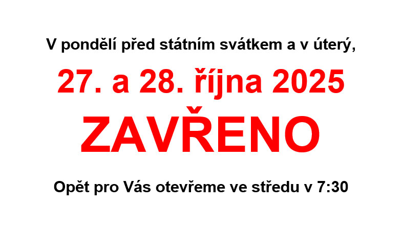 Vzhledem k úternímu státnímu svátku, dne 28. 10. 2025, zůstane naše prodejna, také v pondělí 27. 10. 2025, pro veškerý provoz uzavřena. Objednávky zaslané později než v pátek ráno a samozřejmě rovněž objednávky zaslané prostřednictvím eshopu www.knk.cz, budou tedy vyřízeny a zboží odesláno v průběhu středy 29. 10., kdy bude opět obnoven běžný provoz a to v obvyklých hodinách, od 7:30 do 12:00 a od 13:00 do 15:30.