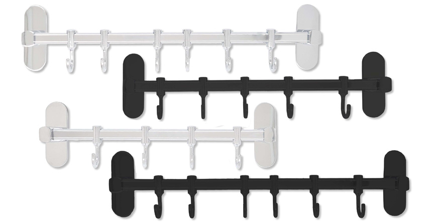 Naše nabídka se také rozrostla o několik nových věšáků, matných černých věšáků k přišroubování KAMIL I (větší bez puntíků) a KAMIL II (menší bez puntíků) a dále samolepících věšákových sestav ČENDA se čtyřmi, pěti či šesti posuvnými háčky dodávaných v provedení galvanický lesklým chrom či černý lak, v celkových délkách 323, 373 a 403mm. Připevnění věšákových sestav je realizováno pomocí samolepicích pásek 3M, přitisknutím věšáku na odmaštěný podklad, maximální nosnosti dosáhne po cca 24 hodinách od nalepení.