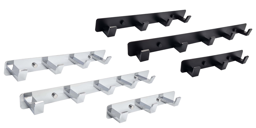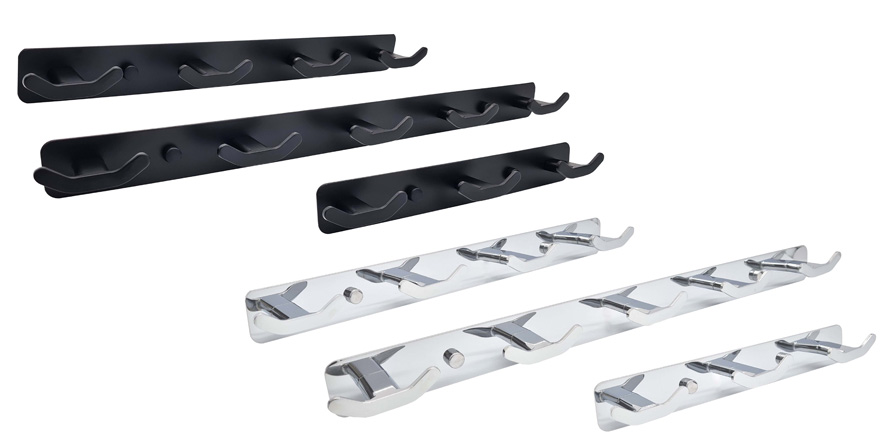 Do nabídky zboží naší vzorkové prodejny a eshopu www.knk.cz jsme doplnili dva druhy kovových věšákových lišt výšky 40mm se třemi, čtyřmi a pěti háčky, v provedení lesklý chrom a černý matný lak. Tyto věšáky jsou baleny jednotlivě v PVC obalu s otvorem k zavěšení, přičemž součástí balení je také montážní materiál pro připevnění věšáku ke standardní stěně, obsahující hmoždinku pr. 6mm, dva vruty s křížovou drážkou a speciální hlavou s vnějším závitem, na kterou přijde našroubovat přiložené krytky pr.12mm, čímž dojde k zakrytí upevňovacích šroubů.
