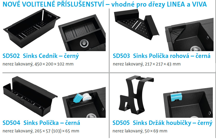 Dále do nabídky doplňujeme další akční příslušenství ke dřezům LINEA a VIVA vyrobených z lakovaného nerezu - SD502 sinks cedník černý, SD503 Sinks polička rohová černá, SD504 Sinks polička černá, SD505 Držák na houbičku černý, SD506 přípravná deska z jasanového dřeva. Také se nám ještě podařilo ještě stlačili cenu oblíbeného nerezového dřezu s odkapem Classic 760, který u nás můžete objednat samostatně za 1098,-Kč včetně DPH (cena z akční nabídky, snížená o 18% za nákup v KNK CZ) v provedení s malou i velkou výpustí a samozřejmě také v rámci zvýhodněných setů s bateriemi PRONTO, EVERA, VITALIA či LEGENDA S. Součástí každého námi dodávaného dřezu je standardně sifon pro úsporu místa s odbočkou na myčku a nadstandardní záruka 5-20let s řešením záruky v místě montáže dřezu (platí pouze pro montáž v rámci ČR).