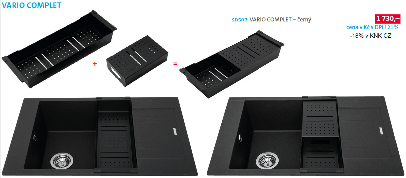 Součástí aktuální akční nabídky je rovněž nový variabilní dřez VARIO 780 (momentálně dostupný v barvách GR74-METALBLACK, GR30-GRANDBLACK, GR72-TITANIUM a GR50-SAHARA) s možností důmyslného příslušenství VARIO COMPLET v černé barvě, opět za cenu uvedenou v letáku zlevněnou o dalších 18% za nákup dřezu v KNK CZ Svratka (stejně jako u všech ostatních nabízených dřezů ve standardní akční nabídce).