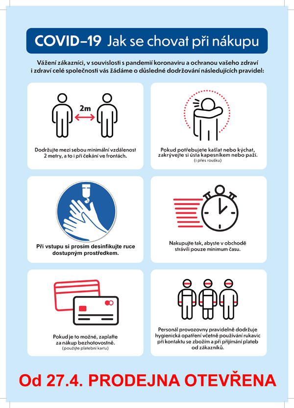 v souvislosti s uvolňováním mimořádných opatření, zavedených kvůli nákaze COVID-19, si Vám dovolujeme oznámit, že od pondělí 27.4., opět otevíráme naší prodejnu ve Svratce také pro běžný provoz. Při návštěvě však prosím dodržujte hygienická opatření a podmínky doporučené MZČR. Děkujeme a těšíme se na další spolupráci.