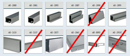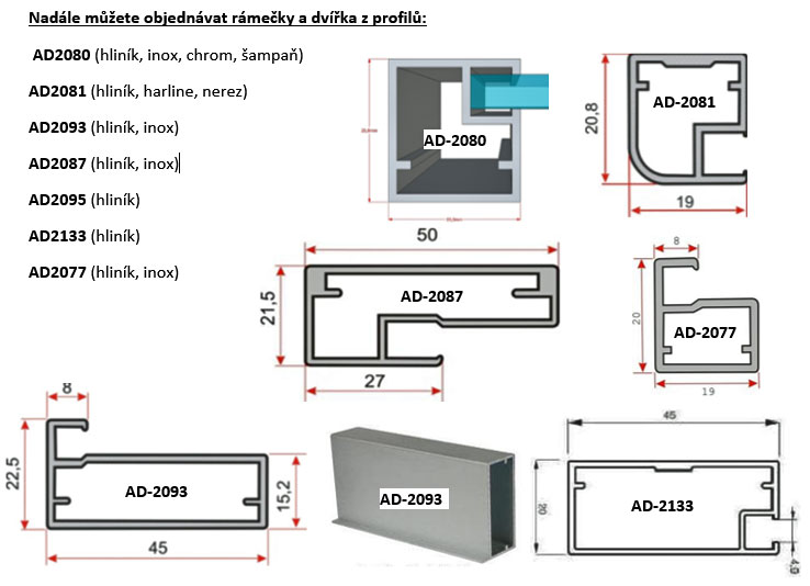 Nadále jsou tedy dostupná dvířka a rámečky z profilů AD2080 (tenký hranatý), AD2081 (tenký zaoblený), AD2093 (široký z tenkou pohledovou stranou) , AD2087 (široký se středně širokou pohledovou stranou), AD2095 (tenký s tenkou pohledovou stranou), AD2133 (pro vlepení výplně) a AD2077 (široký). Kompletní hliníková dvířka dodáváme smontovaná včetně výplně a kování (panty, výklopy, plynové vzpěry) a případnými otvory pro úchytky. Rámečky bez výplně dodáváme včetně těsnících lišt a mohou být dodány smontované či, pro snazší a lacinější přepravu, v částech pro montáž u zákazníka.