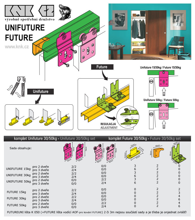 Sady kování UNIFUTURE pro dveře s vyšší hmotností 30 a 50kg, stejně jako ostatní nábytkové sady kování pro posuvné dveře, stavební sady pro posuvné dveře a sady pro posuvné dveře vestavných skříní, stejně jako další prvky kování LAGUNA pro výrobu Vašich posuvných dveří, jsou dále v nabídce a rádi Vám je dodáme.