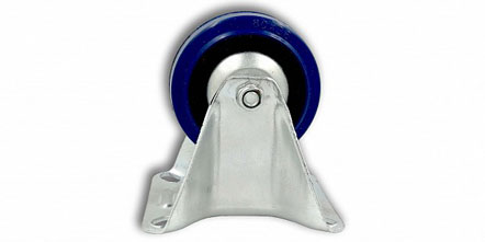 Kombinované pevné zátěžové průmyslové kolečko, třmen z galvanicky pokoveného ocelového plechu, rotační část z galvanizované oceli s modrým gumovým návlekem. Nosnost 100kg. Základna 82x102mm.
