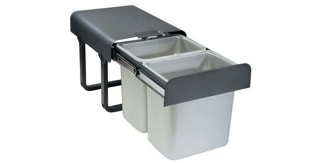 Ručně vysouvaný sorter, za běžně otvíraná dvířka spodní skříňky kuchyňské linky, široké minimálně 400mm, s pevnou a bezúdržbovou laminátovou konstrukcí, pojezdy o nosnosti 30kg a dvěma nádobami 16l. Montáž do dna korpusu a k bočním stěnám. V zavřené poloze zakrývá mechanismus horní otvory obou nádob.