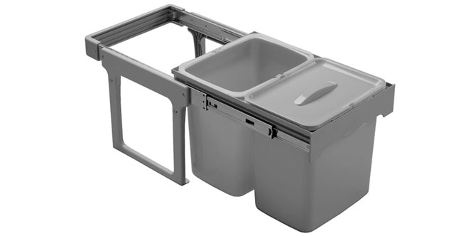 Ručně vysouvaný sorter, za běžně otvíraná dvířka spodní skříňky kuchyňské linky, široké minimálně 400mm, s pevnou a bezúdržbovou laminátovou konstrukcí, pojezdy o nosnosti 30kg a dvěma nádobami 16l, jedna s víkem na směsný odpad. Montáž do dna korpusu a k bočním stěnám.
