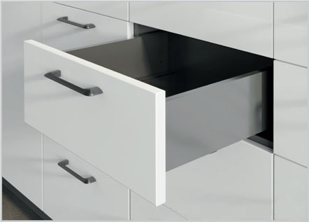 Sada pro výrobu kompletní středně vysoké zásuvky (minimální světlá výška korpusu 147mm) s tenkými hranatými bočnicemi, obsahující skrytý plnovýsuv s tlumeným dovíráním, odstínem antracit lakované ocelové bočnice tl.14mm, kovové příchytky předního čela, příchytky zadního čela, záslepky otvorů pro seřízení zásuvky. Pro výrobu kompletní zásuvky je třeba doplnit pouze libovolné přední čelo zásuvky, dno a zadní čelo z materiálu tloušťky 16mm. Nosnost 40kg.