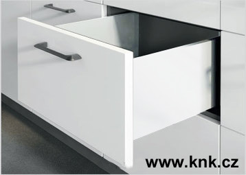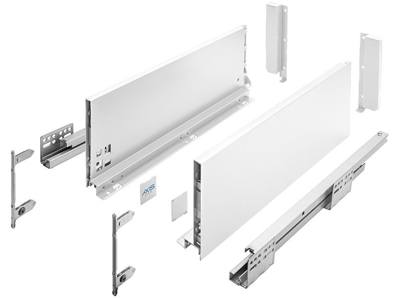 Sada pro výrobu kompletní vysoké zásuvky (minimální světlá výška korpusu 198mm) s tenkými hranatými bočnicemi, obsahující skrytý plnovýsuv s tlumeným dovíráním, bíle lakované ocelové bočnice tl.14mm, kovové příchytky předního čela, příchytky zadního čela, záslepky otvorů pro seřízení zásuvky. Pro výrobu kompletní zásuvky je třeba doplnit pouze libovolné přední čelo zásuvky, dno a zadní čelo z materiálu tloušťky 16mm. Nosnost 40kg.