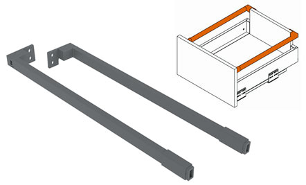 Sada 2ks antracitového čtvercového podélného relingu pro zvýšení zásuvky tvořené boxem GT AXIS PRO délky 450mm, včetně prvků pro připevnění relingu a možností délkové regulace. Výška vyráběné zásuvky může být libovolná (daná pouze zvolenou výškou čela a zad zásuvky a požadovanou tuhostí).