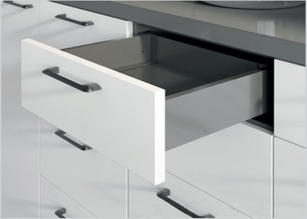 Sada pro výrobu kompletní nízké zásuvky (minimální světlá výška korpusu 115mm) s tenkými hranatými bočnicemi, obsahující skrytý plnovýsuv s tlumeným dovíráním, odstínem antracit lakované ocelové bočnice tl.14mm, kovové příchytky předního čela, příchytky zadního čela, záslepky otvorů pro seřízení zásuvky. Pro výrobu kompletní zásuvky je třeba doplnit pouze libovolné přední čelo zásuvky, dno a zadní čelo z materiálu tloušťky 16mm. Nosnost 40kg.