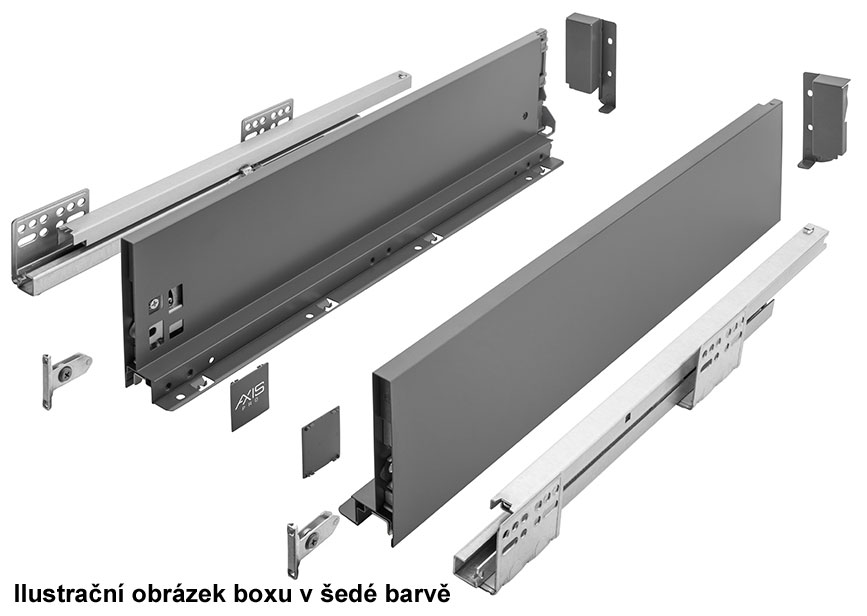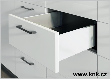 Sada pro výrobu kompletní středně vysoké zásuvky (minimální světlá výška korpusu 147mm) s tenkými hranatými bočnicemi, obsahující skrytý plnovýsuv s tlumeným dovíráním, bíle lakované ocelové bočnice tl.14mm, kovové příchytky předního čela, příchytky zadního čela, záslepky otvorů pro seřízení zásuvky. Pro výrobu kompletní zásuvky je třeba doplnit pouze libovolné přední čelo zásuvky, dno a zadní čelo z materiálu tloušťky 16mm. Nosnost 40kg.