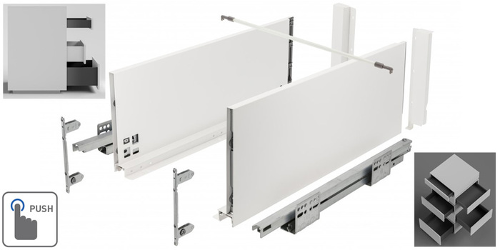 PUSH TO OPEN sada pro výrobu kompletní bezúchytkové EXTRA vysoké zásuvky (minimální světlá výška korpusu 230mm) s tenkými hranatými bočnicemi, obsahující skrytý plnovýsuv s mechanismem pro povysunutí zásuvky zatlačením na čílko, bíle lakované ocelové bočnice tl.14mm, kovové příchytky předního čela, příchytky zadního čela, záslepky otvorů pro seřízení zásuvky. Synchronizační tyč AX-SYNCHRO.35 není součástí setu, v případě potřeby a výroby širší zásuvky je třeba ji zakoupit zvlášť.