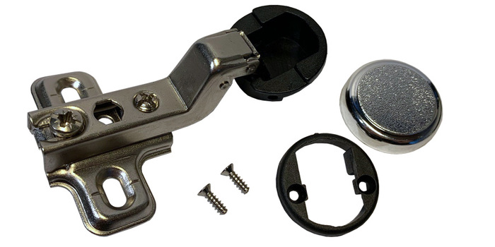 Mini 26mm celokovový závěs pro vrtaná skleněná naložená dvířka, s krytkou a úhlem otevření 110 stupňů, dodávaný s namontovanou podložkou na vrut. Součástí dodávky je rovněž kulatá chromovaná krytka s rámečkem a vruty k jejímu připevnění. V případě zájmu o jinou krytku, je třeba ji objednat zvlášť (matný chrom, tvar D)