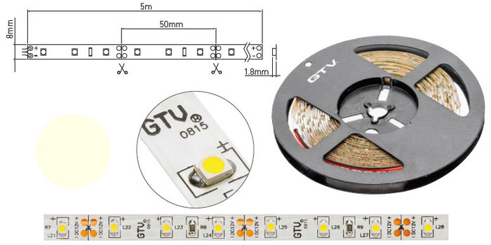 300lm/m, 120° barva teplá bílá 3200K, dělitelný po 50mm. Cca 13cm přívod.