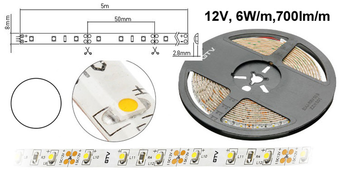 Pmax=6W/m, 700 lm/m, 120_ barva denní bílá 4000K, dělitelný po 50mm.