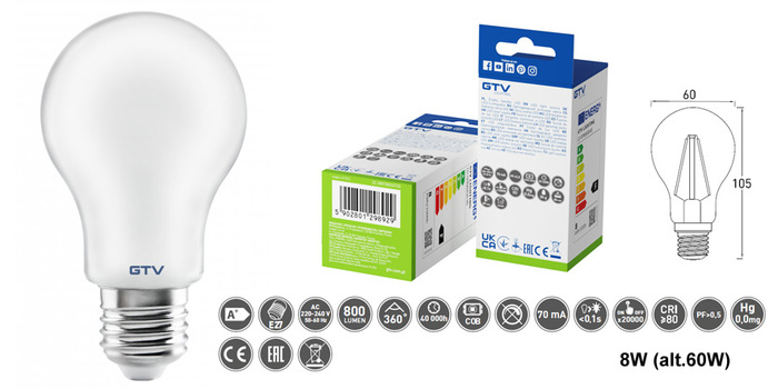 LED žárovka mléčná světelný zdroj 12W denní bílá (4000K), 800lm (náhrada cca 60W klasické žárovky do patice E27 s velkým závitem), nestmívatelná. 220-240V 50-60Hz, PF>0,5, úhel svitu 360°, čipy COB filament, životnost 40000h, sepnutí 20000x, CRI>80, start<0,1s