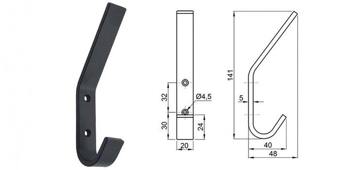 Celokovový šatní věšák se dvěma háčky z komaxitováním povrchově upravené slitiny hliníku, k přišroubování na stěnu pomocí dvou otvorů pr.5mm, dodávaný včetně vrutů.