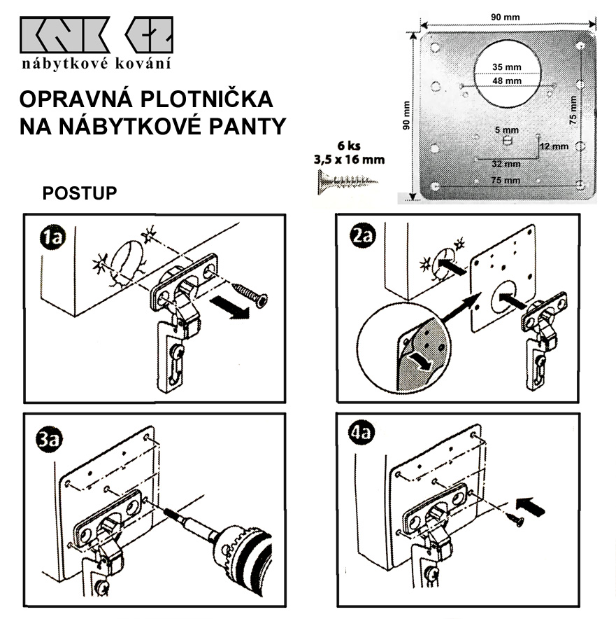 Sada opravné destičky z broušené korozivzdorné oceli pro řešení vylomených NK závěsů, či vytržených šroubů fixujících panty k nábytku, s miskou průměru 35mm a vzdáleností otvorů na misce 45 či 48mm, na dvířkách či korpusu nábytku, opatřená dvaceti otvory pro snadnou opravu a montáž jakéhokoli NK závěsu. Součástí sady je rovněž šest vrutů 3,5x16mm pro připevnění destičky k poškozené části nábytku. Závěsy se do destičky upevňují pomocí stávajících vrutů, případně je samozřejmě možno objednat vruty nové (Pro montáž závěsů ideálně pr.3,5x16mm). Nerezová destička je opatřena krycí ochranou fólií, kterou je třeba při montáži sejmout.
