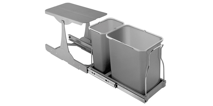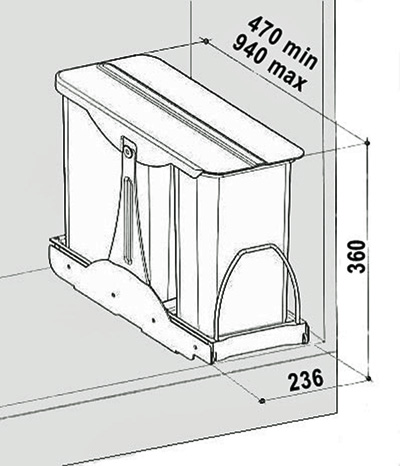 Ručně vysouvaný sorter, za běžně otvíraná dvířka spodní skříňky kuchyňské linky, široké minimálně 300mm, s pevnou a bezúdržbovou laminátovou konstrukcí, pojezdy o nosnosti 30kg a dvěma nádobami 1x8l a 1x16l. Montáž do dna korpusu. V zavřené poloze zakrývá mechanismus horní otvory obou nádob.