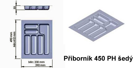 Kód produktu: 06 451.35 Šestiprohlubňový příborník vyrobený ze stříbrného plastu bez další úpravy, uzpůsobený ke zmenšení rozměrů dle zásuvky uříznutím. Rozměry: d.410-490 š.330-390 v.55 mm