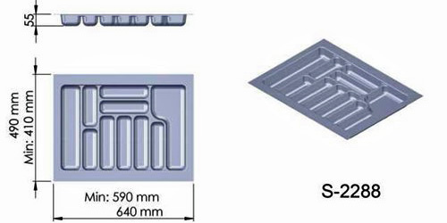 Desetiprohlubňový příborník vyrobený ze stříbrného plastu bez další úpravy, uzpůsobený ke zmenšení rozměrů dle zásuvky uříznutím. Rozměry: d.410-490 š.590-640 v.55mm