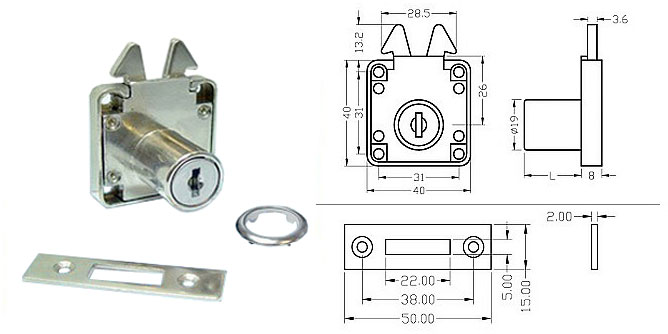 Kód produktu: 30130.03 Celokovový roletový zámek, galvanicky pokovený, dodávaný v krabičce včetně dvou kusů cylindrických klíčků a protiplechu k zadlabání. Rozměry: d.57 š.9 v.40 mm