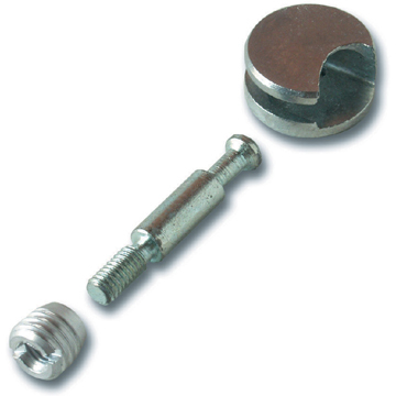 Kód produktu: 51234011.14 Třídílný komplet excentru pr.25mm ze slitiny zinku, ocelového galvanicky pokoveného táhla a hliníkové závrtné matice, pro rozebíratelné spojení nábytkových dílců minimální tloušťky 18 mm.