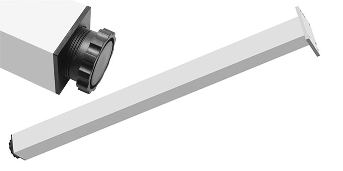 Stolová noha vyrobená z eloxovaného hliníkového profilu 60x60mm tl.1mm, se spodní rektifikací (0,+30mm) z černého plastu a destičkou 100x100x8mm šroubovanou k noze čtyřmi šrouby M4x20mm.