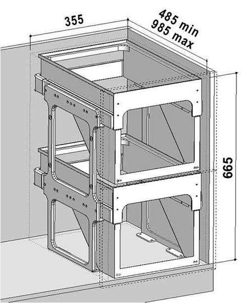 Dvoupatrový sorter s pevnou a bezúdržbovou laminátovou konstrukcí a pojezdy o nosnosti 30kg. Spodní patro s jednou nádobou 34l vysouváno připojenými dvířky, horní patro se dvěma nádobami 16l k ručnímu vysouvání. K zabudování do spodní kuchyňské skříňky, široké 400mm, montáž do dna korpusu a k bočním stěnám. Cena zahrnuje montážní sadu + 1x víko na směsný odpad (pro nádobu 16l).