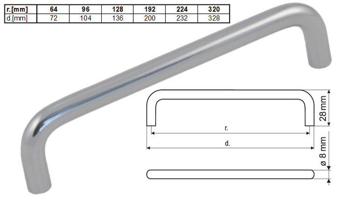 Kód produktu: US10 320 S.43 Celokovová jednodílná úchytka s povrchovou úpravou aseptic matný balená včetně šroubků M4 pro uchycení. Rozměry: r.320 d.328 š.8 v.28 mm