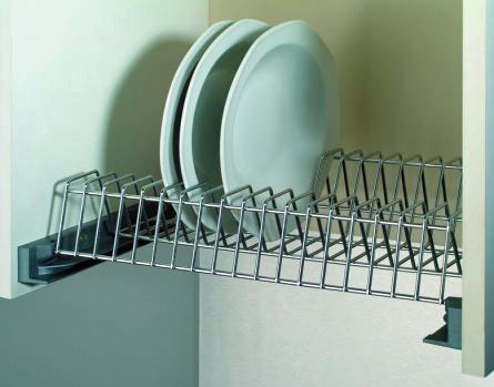 Vestavný chromovaný odkapávač, police na talíře do horních skříněk kuchyňské linky šířky 450mm. Konstrukce neumožňuje namontovat jako dno skříňky. Plastové bočnice jsou opatřeny drážkou, do které lze zasunout nerezovou nebo plastovou misku k zachycení odkapané vody.
