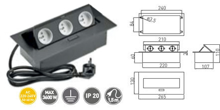 Výklopná 3zásuvka do desky stolu či linky a otvoru 223x108 mm , se třemi uzemněnými zásuvkami a kabelem délky 150cm. Barva černá.
