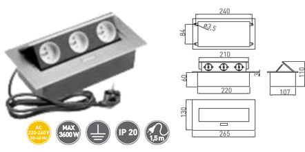 Výklopná 3zásuvka do desky stolu či linky a otvoru 223x108 mm , se třemi