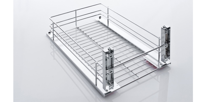 Provedení koše s drátěným dnem. Na připevnění koše do skříně jsou nutné výsuvy označené VK.BLUM.480 s tlumením nebo VK.HETTICH.480.T s tlumením, které nejsou součástí výrobku a objednávají se samostatně.