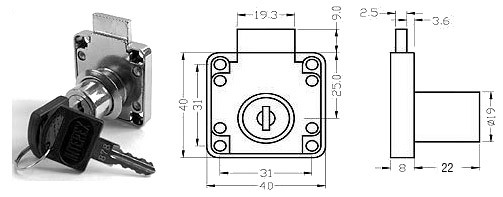 Kód produktu: 101301.03 Celokovový zásuvkový zámek galvanicky pokovený, dodávaný v krabičce včetně dvou kusů cylindrických klíčků. Rozměry: d.40 š.30 v.40