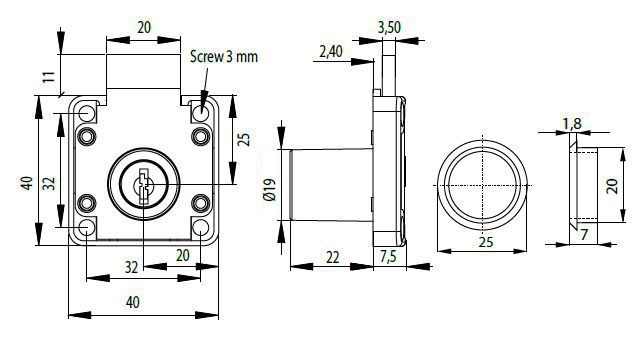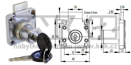 Kód produktu: 101700.03 Celokovový zásuvkový zámek galvanicky pokovený, dodávaný v krabičce včetně dvou kusů cylindrických klíčků. Rozměry: d.40 š.30 v.40