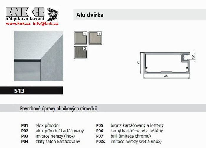 Hranatý široký rámeček, š.45x20, pohledová hrana 45mm, pro vsazení výplně do tloušťky max.5,2mm (standardně s těsněním pro výplň 4mm). Úchytky doporučujeme vrtat skrz rámeček, 9-30mm od hrany. Standardní panty, výklopy, plynové vzpěry jako u DTD dveří. Maximální rozměr rámečku je 2500x600mm, pro rámečky z plochou větší než 1,2m2 je třeba přidat dělící příčku.