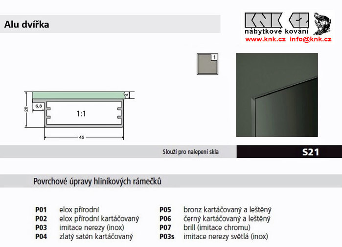 Hranatý široký rámeček pro bezúchytkový systém dvířek, š.45x20, bez pohledové hrany, pro nalepení libovolné neprůhledné výplně. Profil na straně pantů je S16, zbytek S21. Možno použít standardní kování, jako pro LTD.